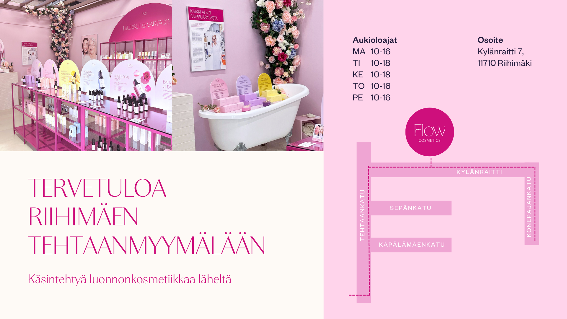 Riihimäellä valmistettava Flow Cosmetics on luonnonkosmetiikkasarja, jonka valikoimasta löydät saippuoita, ihon- ja hiustenhoitotuotteita sekä luomulaatuisia eteerisiä öljyjä. Lisäksi meillä on outlet-hylly, jossa on vaihtelevasti erilaisia poistoeriä tuotteistamme.