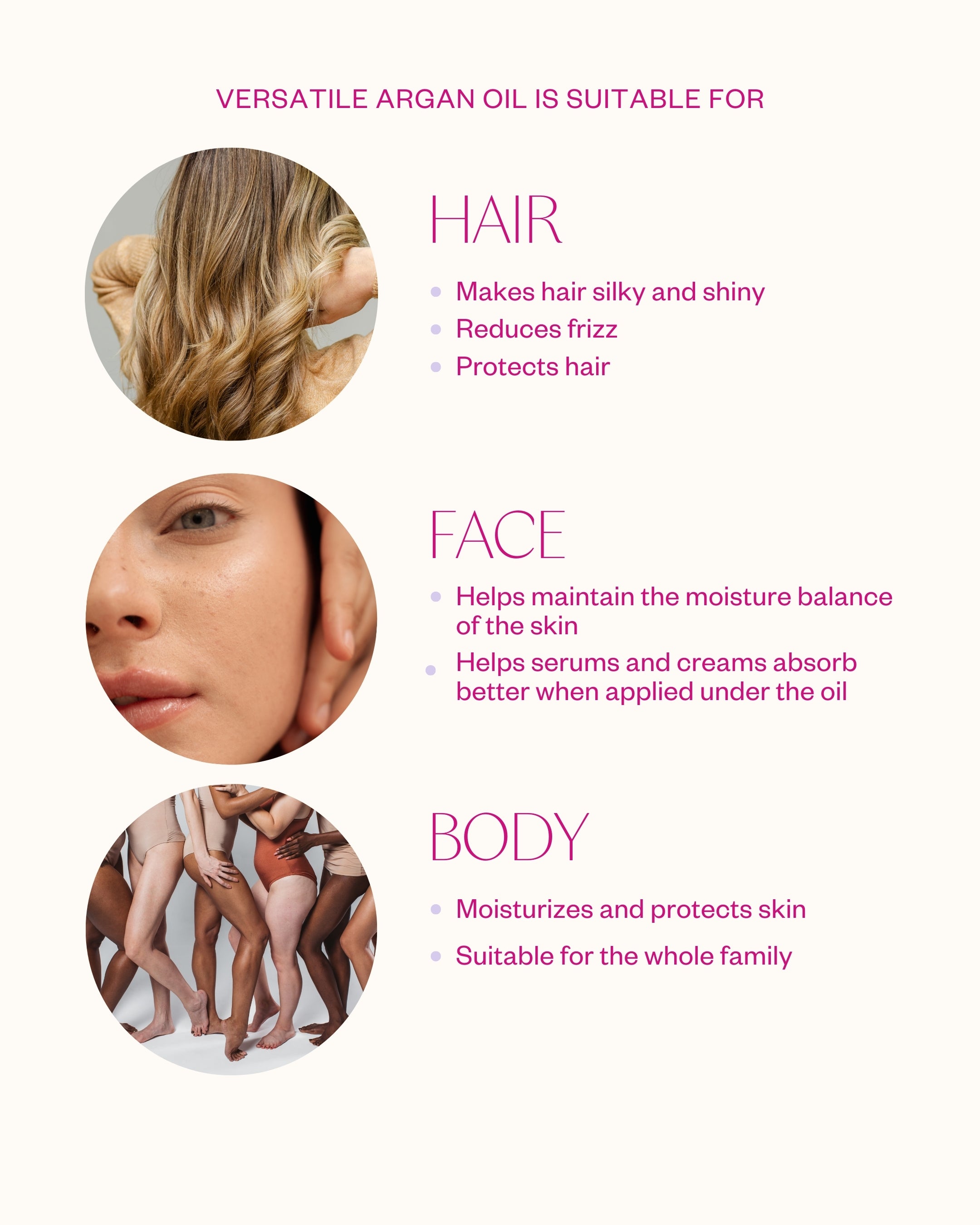 This 100% organic argan oil nourishes both the skin and hair. It has softening and moisturizing properties, providing antioxidant protection for the skin, while adding softness and shine to the hair. This versatile product is suitable for all ages, from head to toe. It is suitable for all skin types, especially for those with allergies or fragrance sensitivities.
