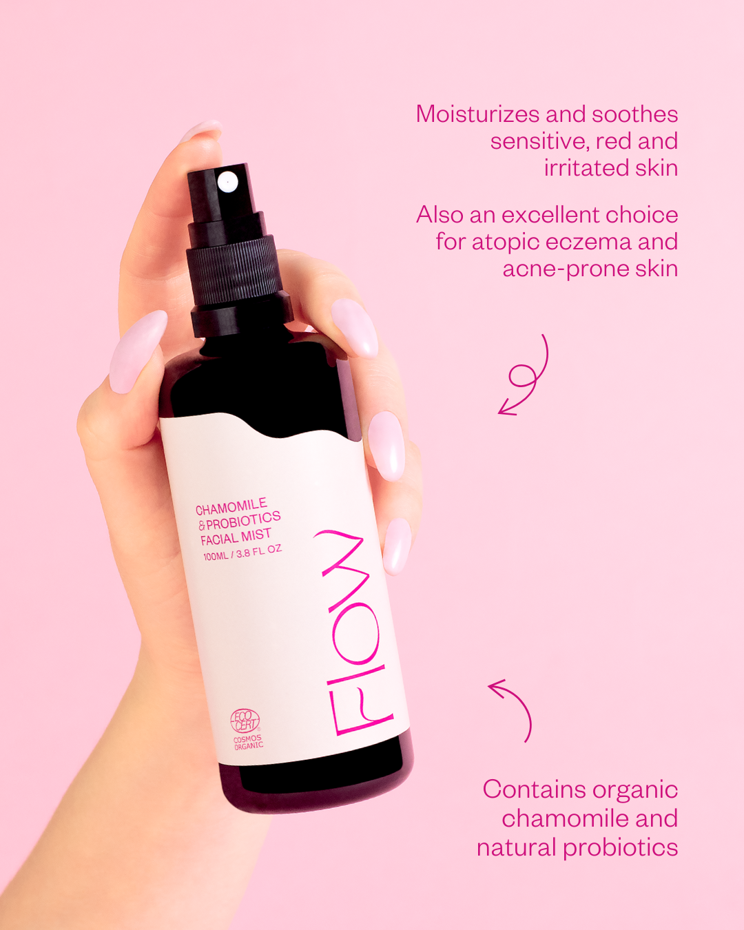This probiotic chamomile water deeply hydrates and soothes the skin, scalp, and entire body. It combines a premium-quality, anti-aging natural probiotic with organic chamomile water, known for its antimicrobial and calming properties that help reduce redness and inflammation. This gentle treatment mist is specially designed for sensitive, atopic, irritated, red, and dry skin, but it is suitable for all skin types including perioral dermatitis (POD).