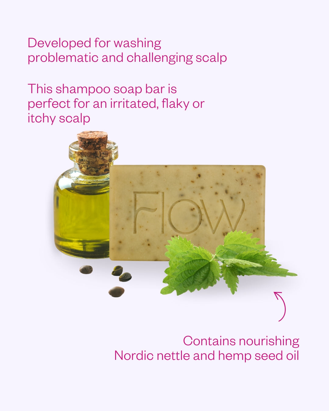 The vegan Hemp Shampoo Bar contains cold-pressed Finnish hemp seed oil, known for its ideal ratio of essential omega-3 and omega-6 fatty acids – nourishing both scalp and hair. The formula is enriched with calming nettle, purifying green clay, and a targeted blend of essential oils designed specifically for scalp issues.