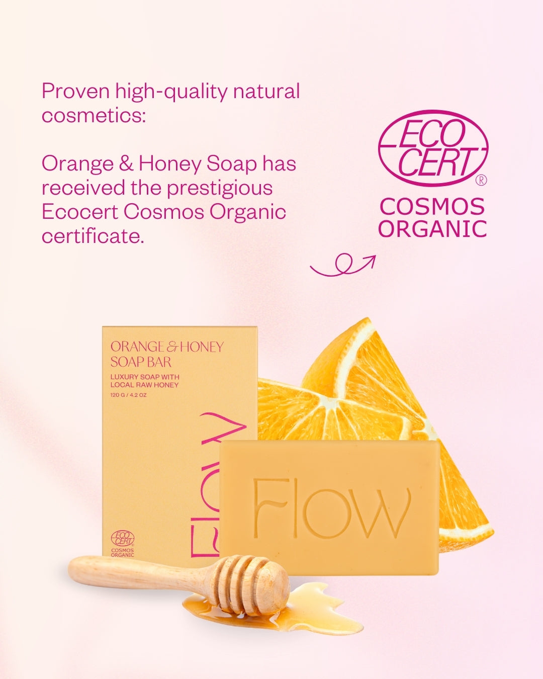 Proven high-quality natural cosmetics: Orange & Honey Soap Bar has received the prestigious Ecocert Cosmos Organic certificate.