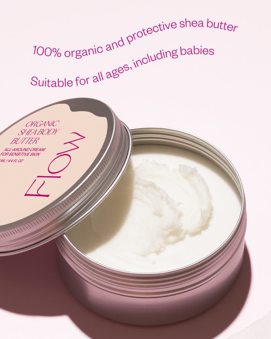 Flow Cosmetics' shea butter is always certified organic, fragrance-free, preservative-free, and colorant-free. This single-ingredient cream is excellent for even sensitive skin and for babies.