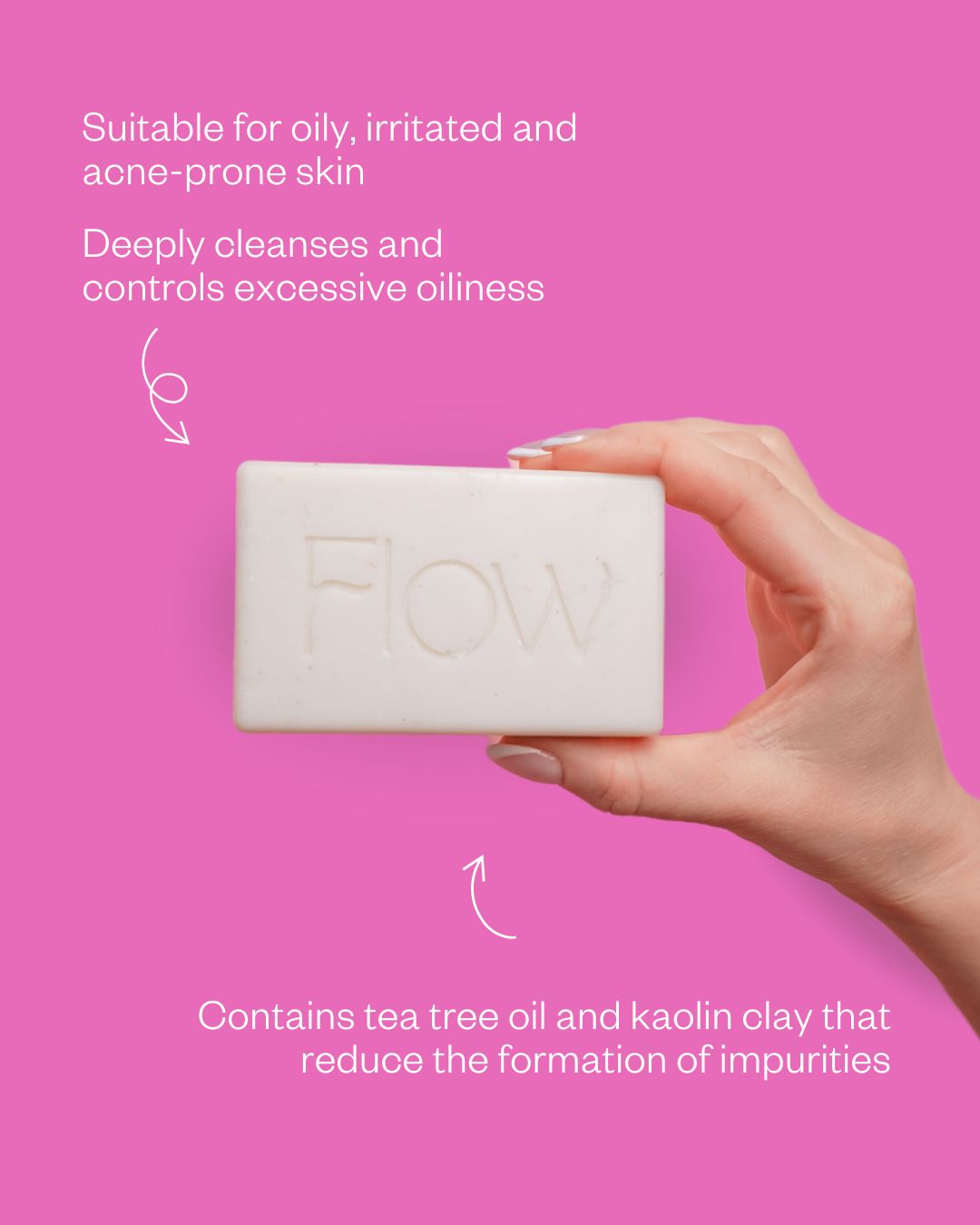 This tea tree oil containing cleanser for oily and blemished skin helps control acne and balance oil production. Suitable for treating various skin problems across the entire body. Flow Cosmetics' bar soaps are handmade in Riihimäki using the finest organic ingredients.
