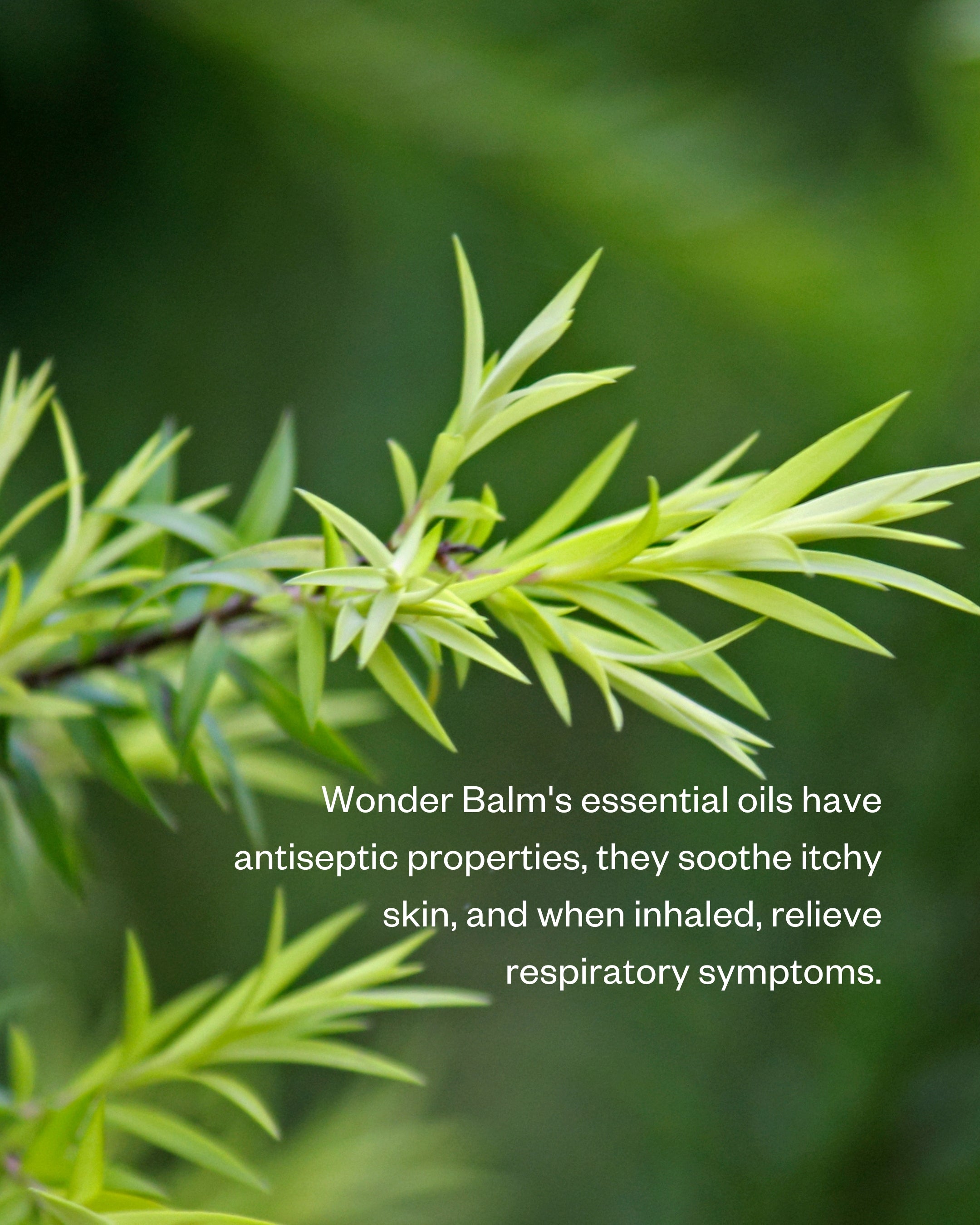 A repairing balm containing eucalyptus and tea tree oil for many ailments! The effectiveness of the strong, organic beeswax-based Wonder Balm treatment balm is based on the powerful essential oils of eucalyptus, tea tree, lavender, and sandalwood, and their skin-soothing as well as aromatherapeutic properties. The balm has a strong fresh scent of eucalyptus and tea tree, with a menthol coolness.